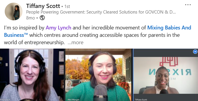 “I’m so impressed with everything you’ve accomplished, looking forward to seeing more of all the great things you do, all the power moves you pull, you’re a trailblazer for Moms every where – thanks to you Invest Ottawa has changing tables in their washrooms.”