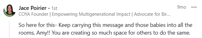 “Amy leads by example and influences change with creative solutions to help parents continue with professional development and networking during a very precious time in the life of the parent-child early years. Employers, meeting and conference planners, parents, join the movement and support this much needed initiative.”