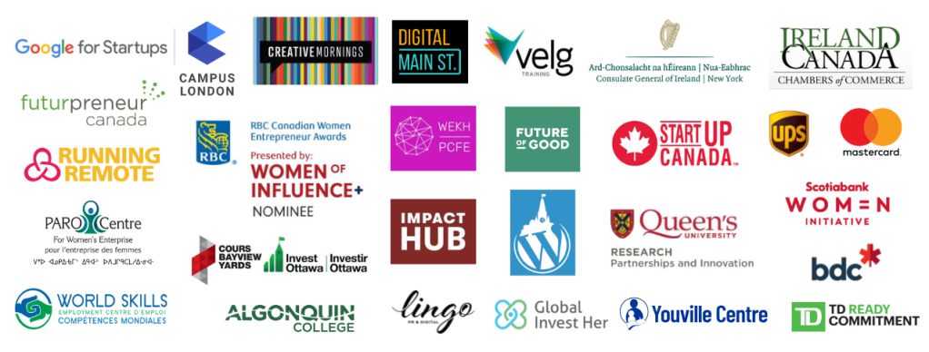 It’s been named one of Canada’s Top 100 Recovery Projects in 2020 by Future of Good, a Startup Canada Community and Ecosystem Partner since 2021 and I’ve spoken on virtual, hybrid and in person stages (with and without my kids) over the years for CreativeMornings, Running Remote Conference, Impact Hub, Queen’s University, PARO Centre for Women’s Enterprise, Global Invest Her, Women’s Entrepreneurship Knowledge Hub and Digital Main Street.