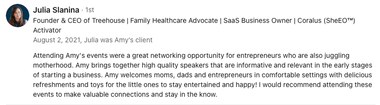 “Amy leads by example and influences change with creative solutions to help parents continue with professional development and networking during a very precious time in the life of the parent-child early years. Employers, meeting and conference planners, parents, join the movement and support this much needed initiative.”