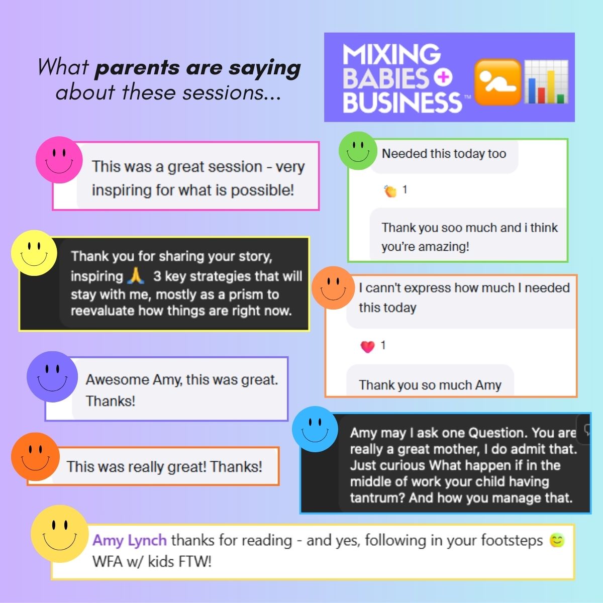 Feedback on Mixing Babies And Business™ trainings, events, resources and advocacy by Amy Lynch